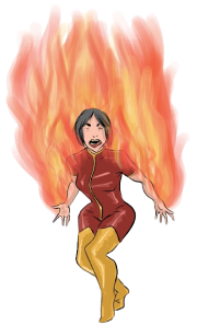 Essa vilã é bastante perigosa e esquentada, quem se aproxima dela, corre o risco de queimar-se em suas chamas que são lançadas de suas mãos e olhos.